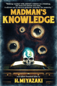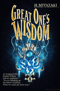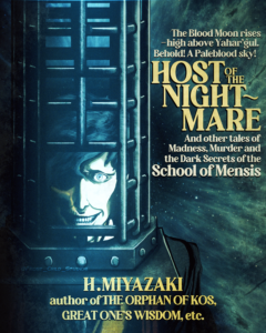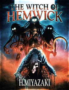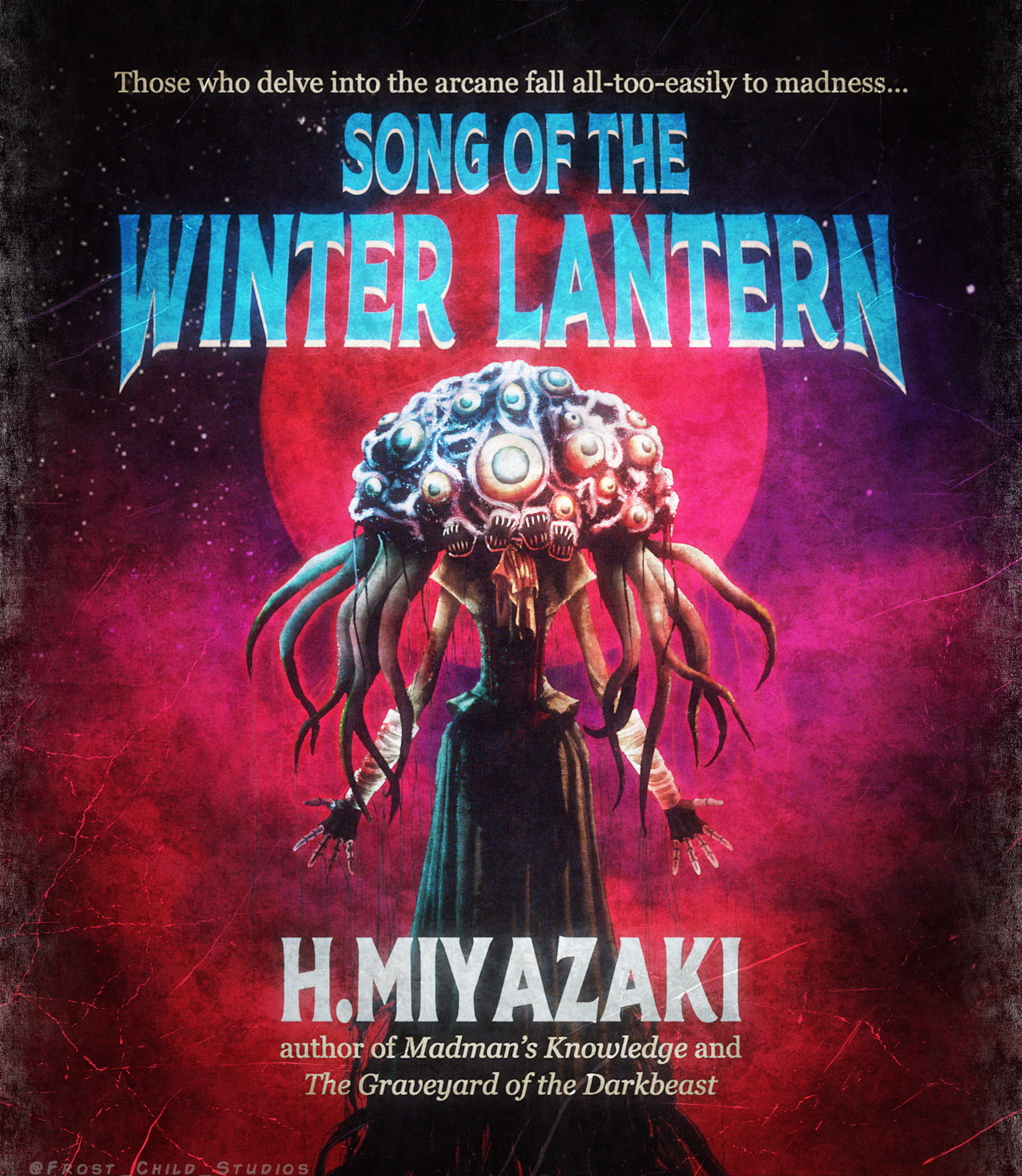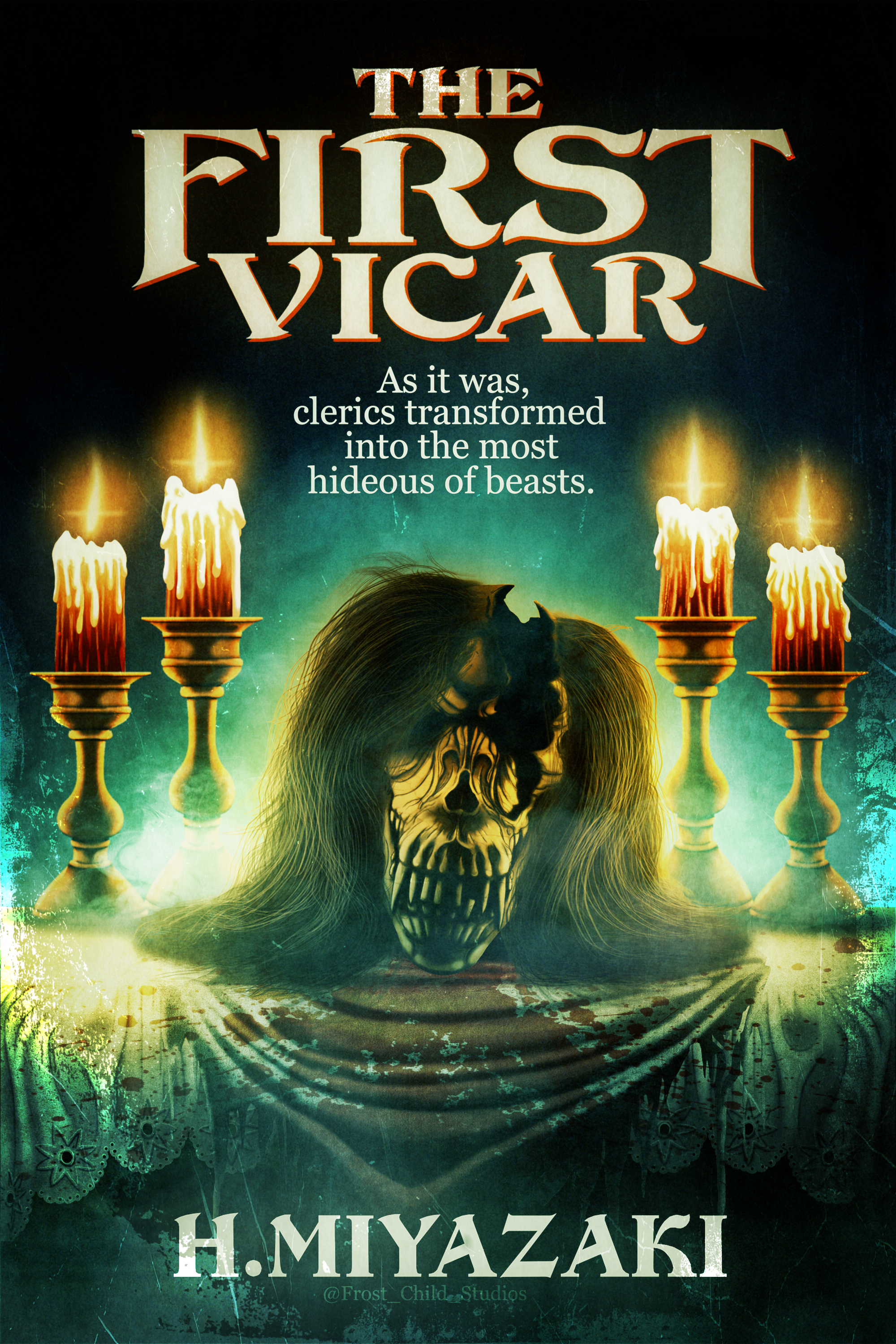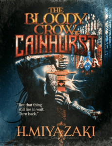 Items and characters from the game Bloodborne in the style of retro paperback horror novels, taking inspiration from Stephen King and Dean Koontz.